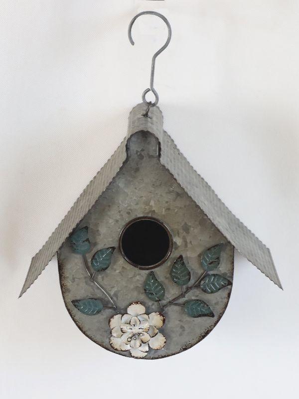 This charming handcrafted hanging birdhouse features a distressed finish and delicate floral accents, making it the perfect piece of rustic garden or patio decor. Ideal for nature lovers, this unique metal bird feeder house brings a touch of farmhouse cottage charm to any outdoor or indoor space.